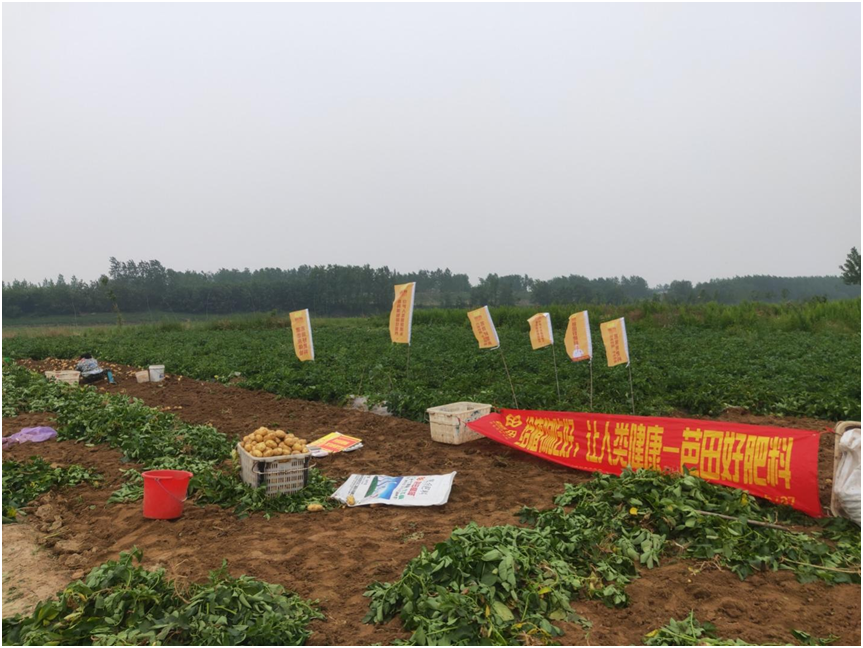 为了测算土豆的产量和肥料效果,鄂中片区营销经理董留强带领科技经理早早的来到袁大哥的地里,随机选择了3个平方进行测产。在测产过程中,他们惊讶地发现,每株结果有2-3斤,而且个头大,颜色金黄,没有畸形果,商品率可达95%以上,每一平方收获的土豆称重有15斤多。