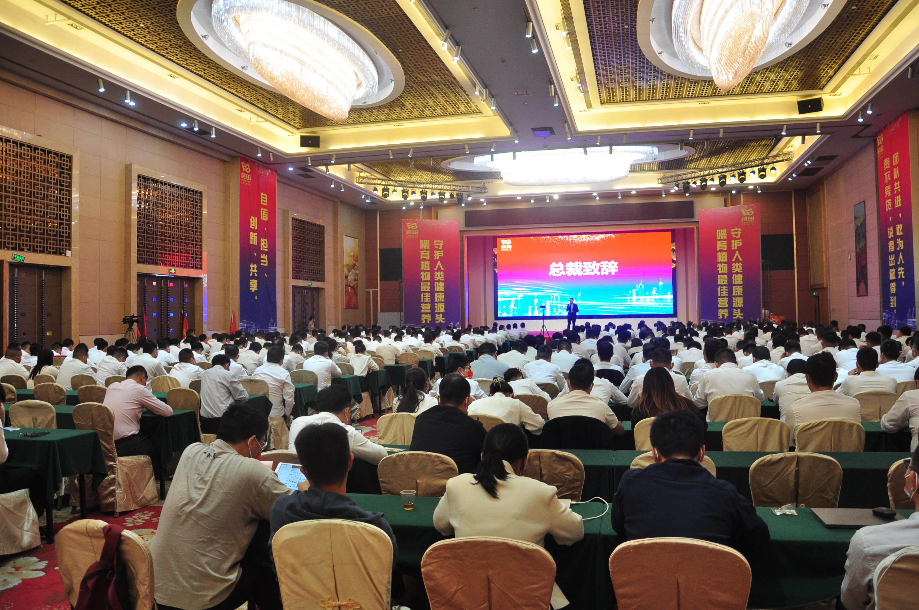 “占山头,插旗帜;广北齐心,其利断金!”、“乘风破浪行万里 业绩翻番四川军”…… 一句句昂扬的誓师口号,铿锵有力,掷地有声,响彻整个会场,展示了芭田营销战狼们不完成目标誓不罢休的气概和血性。