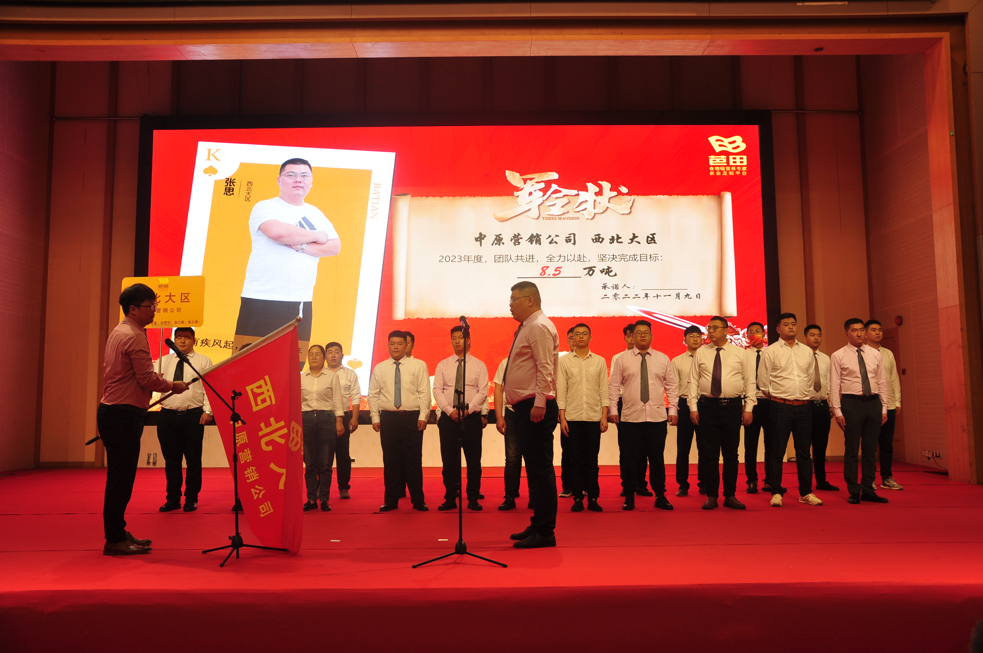 唯有拼搏,才不负年华。唯有奋斗,才能激发出强烈的战斗力。军令如山,使命必达!誓师大会环节,在各营销公司总经理的带领下,各大区负责人郑重地接过战旗,立下2023年度销量目标,进行团队风采展现。