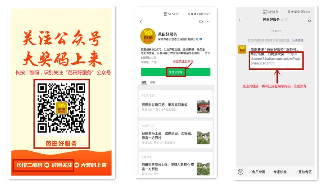 10月25日起购买芭田活动款产品,扫描包装袋内部的二维码,关注“芭田好服务”微信公众号,即可参与抽奖。