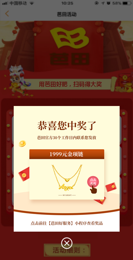 4、点击中奖界面中的“点击查看”按钮,即可跳转“芭田好服务农户端”小程序,查看奖品