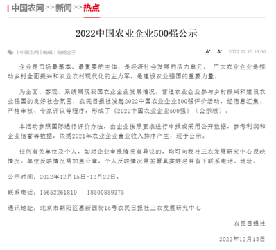 近期,农民日报社发起的2022中国农业企业500强评价活动,经信息汇集、严格审核、专家评议等程序,形成了《2022中国农业企业500强》(公示版)。深圳市芭田生态工程股份有限公司荣登榜单。