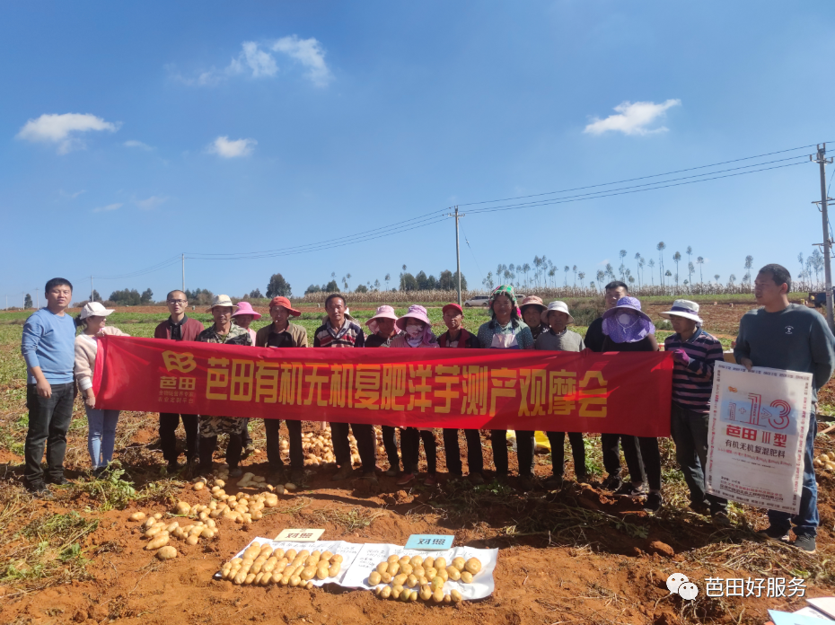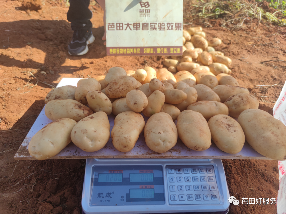 陆良县小百户镇罗贡村农户唐士强选用芭田产品后,土豆同样取得了好收成。唐士强种了3亩土豆,每亩施用2包有机无机16-6-16做底肥,追肥时,亩施好阳光飞马中量元素水溶肥1包。相邻另一块地上,施用同样用量的某进口肥。马铃薯收获后,对比测量数据显示,使用芭田有机无机产品的马铃薯表光好,卖相佳,个头大且均匀,亩产量达3335公斤,对比用其它牌子肥种出的马铃薯,优势非常明显。“要不是今年干旱缺水因素的影响,产量还会更好。”马士强激动地夸芭田复合肥效果好。