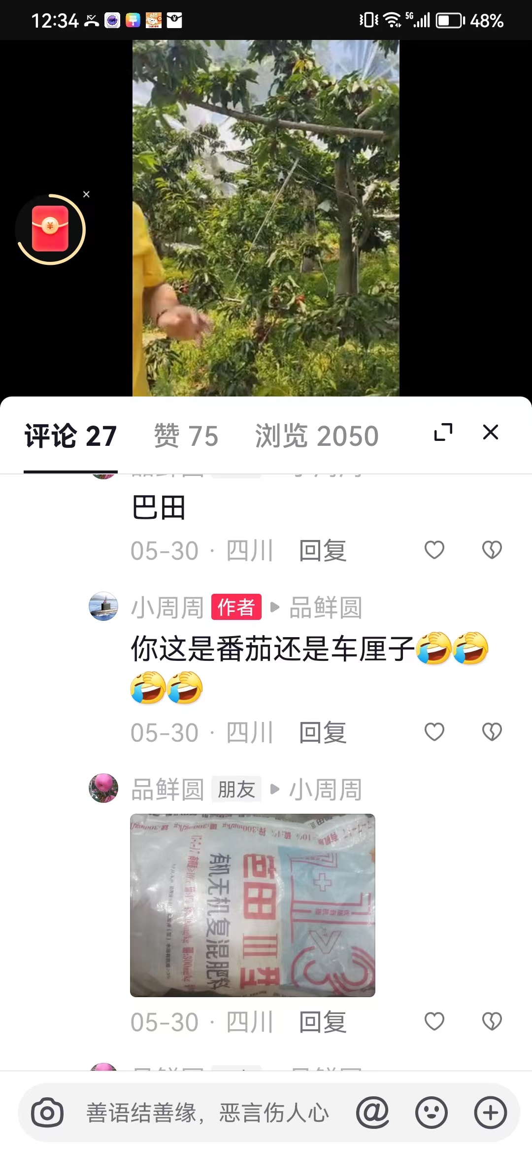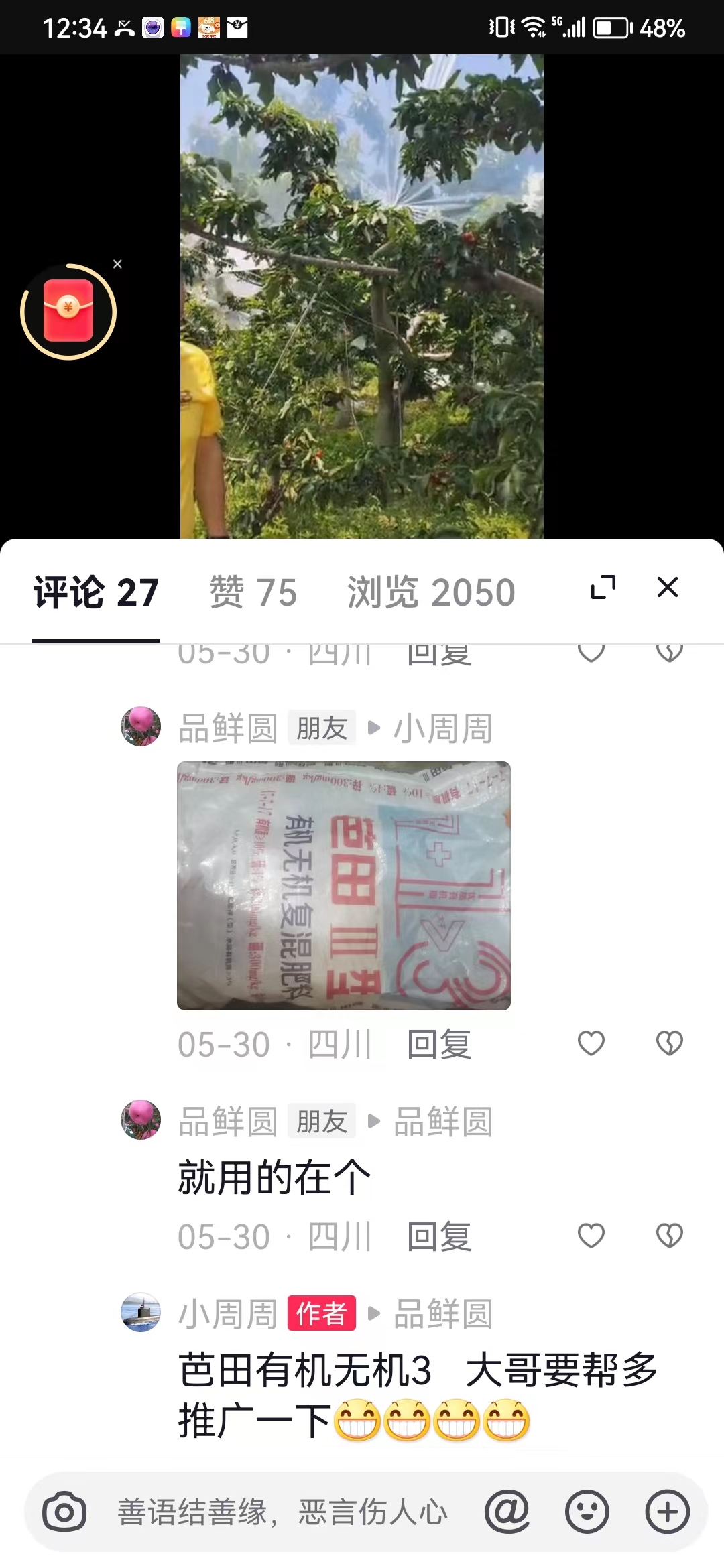 “今年种车厘子时,我选择的产品是芭田有机无机17-7-17复肥,黄金磷复肥。芭田产品见效快,劲大,车厘子上施用后,坐果率高,个头大、均匀,叶片厚实,叶色翠绿,卖价好。自从选择了芭田,7年没有更换过品牌,这就是芭田产品的魅力。”大户王品开心地说。