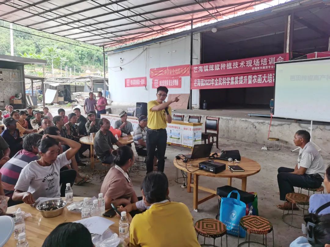 为保障今年秋冬茬辣椒持续丰收,7月10日,芭田股份联合德宏州芒市芒海镇民心蔬菜合作社开展了一场辣椒种植技术现场培训会。300位辣椒种植户参加会议并做种植技术交流。芭田股份农化专家李正涛、芭田中南国际营销公司云德宏营销经理张兴出席活动。