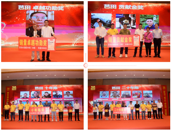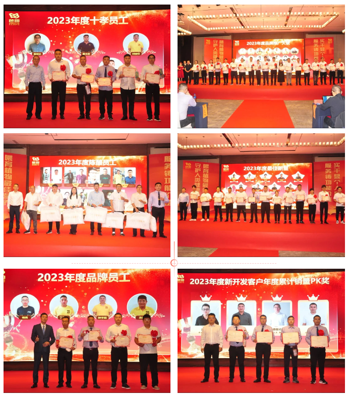 会议现场,为2023年度十年陈奖、二十年陈奖、潜力之星奖、芭田旗帜产品推广奖、芭田重合同守信用履约之星奖、芭田贡献银奖、芭田贡献金奖、芭田卓越功勋奖获得者举行了盛大的颁奖仪式,欧波、林育忠、穆光远及各大区总监为其颁发奖牌和奖品。